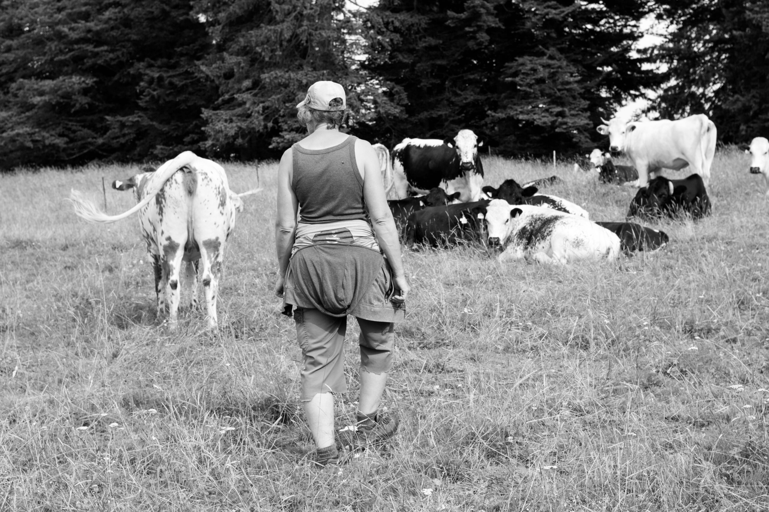 Camille Erbetta, c’est le cœur battant de cette métairie. Avec son mari Dušan Rybacek, elle en a repris les rênes il y a quinze ans. Elle a étudié l’anthropologie à Neuchâtel, voyagé, rencontré Dušan en Tchéquie. Ensemble, le couple a tenu un alpage dans la région de Derborence… Jusqu’au jour où une opportunité s’est présentée : reprendre la Ronde Noire, au-dessus de Mauborget, sur les flancs du Chasseron. Une décision forte, surtout pour un couple non issu du milieu agricole. Et plus encore pour une femme et une personne issue de la migration.